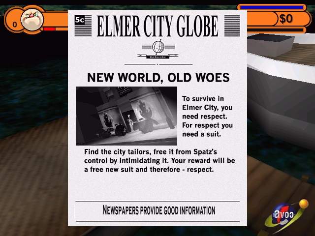 Anche i movimenti sono molto strani: i gangsters sembrano muoversi come in un cartone animato e anche gli effetti sonori, quando ad esempio saltate su un qualche oggetto oppure vi sparano, sembrano quelli di uno degli stupendi cartoni animati della Warner Bros. Ma andiamo con ordine. Respect Inc. non si può assegnare ad un genere preciso di gioco, visto che il concept ideato dai programmatori della Pure non è, a mio avviso, assimilabile a nessun tipo di gioco mai visto fino ad ora. Diciamo che Respect Inc. è una sorta di action/adventure 3D in terza persona, che mantiene, dal punto di vista del sistema di controllo e, ad esempio, della gestione degli oggetti, le caratteristiche di un qualunque Tomb Raider ma che, sia nella visuale che nel modo di affrontare il gioco, è profondamente diverso da ciò che siamo abituati a vedere. La visuale, infatti risulta molto più distante dal personaggio, rispetto ad un normale action/adventure, anche se la telecamera lo segue allo stesso modo, e ci permette anche di fermarci e di passare ad una visuale in prima persona, dalla quale possiamo vedere quello che si trova attorno a noi. L'engine che muove Respect Inc. si può definire solamente discreto, a causa del clipping che lo affligge, soprattutto quando ci troviamo con il personaggio che noi controlliamo vicino a qualche edificio o oggetto. Lo stile dei poligoni che costituiscono i vari ambienti, poi, come potete vedere dalle immagini incluse nella recensione, è molto spoglio. Non ci sono textures che risaltano sul resto, tutto è molto spigoloso e abbastanza scarno. Questo però non è assolutamente un problema da imputare, a mio avviso, all'engine 3D, ma al look generale che i programmatori hanno voluto dare al gioco. Uno stile molto particolare, che vuole proprio ricordare il periodo degli anni '20 - '30 in cui sarebbe ambientato il gioco. Lo scopo di Respect Inc. è molto semplice, dovete portare a termine i livelli che sono stati preparati dai programmatori, eseguendo tutto quello che vi viene espresso dai giornali che potrete trovare mentre camminate nelle varie città del gioco. Tutte le volte che passerete sopra un giornale, potrete leggere delle istruzioni che vi serviranno per portare a termine il livello e capirete, a mano a mano che avanzerete, ciò che dovrete fare. Respect Inc. è definito dai programmatori uno suit 'em up (e già da qui, capite che alla Pure si sono fumati qualcosa di potente...), in cui il vostro compito è quello di guadagnare soldi e acquistare vestiti per guadagnare rispetto (giuro, nel manuale c'è proprio scritto così...) nella vostra professione di gangster. Il vostro nome è Chubsy Malone e, all'inizio del gioco, vi troverete sulla piattaforma di un molo, appena scesi da una nave che vi ha trasportato in questo luogo, per permettervi di diventare il re del crimine. Nella vostra avventura, oltre ad acquistare vestiti per abbigliarvi (chiaramente, si parla di vestiti da gangster, quindi giacca e pantaloni...), dovrete uccidere o, se la cosa vi aggrada di più, farvi amici, intimidendoli, altri criminali o evasi, che vi potranno essere utili negli scontri a fuoco con le bande rivali o con, ad esempio, la polizia. Il problema è che, quando ve ne farete "amico" uno, avrete un numero maggiore di personaggi da controllare e la morte di uno di questi, vi farà terminare prematuramente il gioco. Dal punto di vista della durata, ho idea che il gioco della Pure vi durerà parecchio, siccome il vostro ammontare di energia non è mai molto elevato. Inoltre, bastano pochi colpi di pistola da parte dei nemici, a volte, per farvi fare una brutta fine. Al contrario, i nemici, invece, di energia ne hanno sempre da vendere ai frati, e vi ci vorranno come minimo una decina di colpi di pistola (ricordatevi che i proiettili che avete sono sempre limitati...) per stenderli a terra.