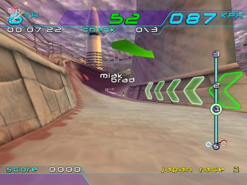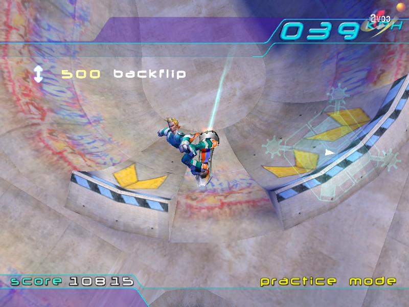Il fatto è all'incirca questo: ogni sfida vinta col tipo arancione vi permetterà di imparare una nuova mossa speciale fino a diventare delle specie di Ninja (non ho contato quante mosse esistono, ma sono tantissime!). Man mano che imparate nuove mosse, vi sarà possibile accedere ad una nuova area del Velodromo in cui allenarvi e compiere nuove sfide. In ognuna di queste aree, in tutto tre (corrispondenti ai tre stati succitati...), c'è una porta che si aprirà solo dopo che avrete vinto tutte le gare dello stato precedente, secondo questo ordine: UK, USA., Japan (quest'ultimo è veramente difficile!!!). La difficoltà sarà in ordine sempre crescente, ma non si arriva a livelli impossibili, considerando il fatto che si finisce tranquillamente in tre giorni se ci si mette di impegno (io sono ammattito all'improvviso, e l'ho finito...), comunque questo non significa che il gioco non sia longevo, anzi.... Penso che chiunque tornerebbe volentieri a giocarci, dopo averlo finito due o tre volte. E' inoltre possibile il gioco a due, cosa ottima per la longevità. Per entrare un pochino nel particolare, e descrivere la parte del gico che secondo me è più gustosa, nelle sfide dovrete utilizzare le nuove acrobazie imparate per: passare attraverso porte situate un po' più in alto del livello del mare, attraversare delle vetrate, rompendole ma senza schiantarcisi sopra, raccogliere delle piccole sfere luminose chiamate "Globi" disposte in posizioni assolutamente assurde, slittare con il tasto "Luge" e poi con quello "Stall" per affrontare le monorotaie. Ovviamente la questione delle sfide non è finita qui: ci saranno delle volte in cui, per vincere, dovrete fare un'enormità di punti (e quindi preparatevi a farvi il nodo alle dita perché le acrobazie corrispondono sempre a una sequenza di tasti...), delle altre, fra cui l'ultima cioè la più difficile, in cui dovrete affrontare quello sfigato in arancione, che purtroppo è un osso durissimo. Per quanto riguarda le piste, cioè Giappone, USA e UK, e queste vanno in crescendo di difficoltà: la prima pista inglese è facilissima e molto lenta, tanto che ci sono rimasto male pensando che anche le altre fossero così, invece ho avuto una piacevole sorpresa scoprendo che la frenesia aumenta man mano che si avanza nel gioco, anzi, in alcune situazioni raggiunge una tale velocità che sembra quasi essere tornati al caro e vecchio Pod della Ubi Soft (uno dei migliori giochi degli ultimi anni e se alla Ubi si degnassero di realizzare un seguito, saremmo loro molto grati...ndBill). Voglio far notare che tutto questo si complicherà molto nel Giappone, fino ad arrivare a livelli quasi impossibili (l'ultima pista è abnormemente difficile!), vi consiglio quindi una buone dose di caffeina se volete finire il gioco.