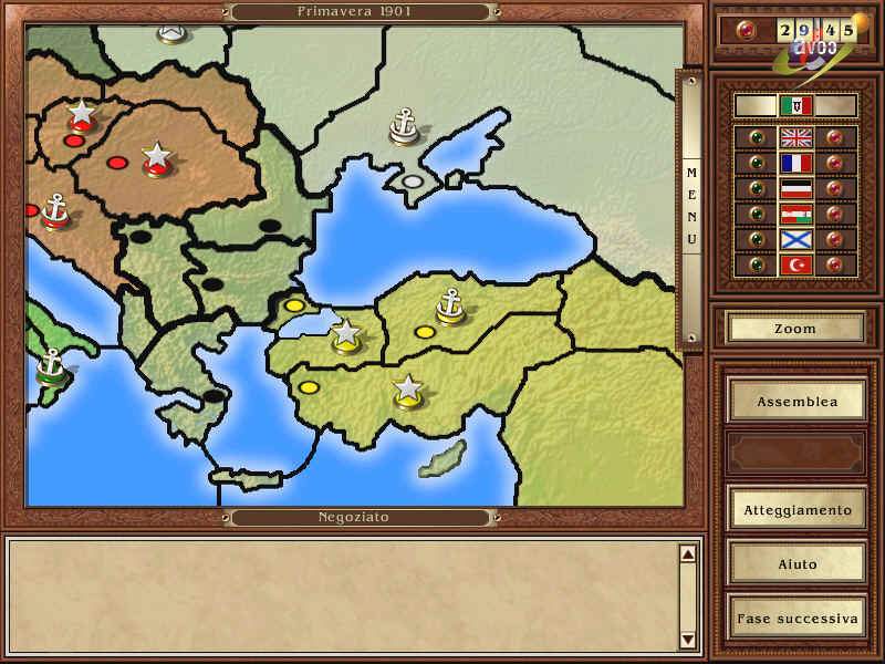 Tutti quanti abbiamo giocato almeno una volta a Risiko! (in almeno una delle varie versioni esistenti, magari anche quelle realizzate per PC...) e abbiamo provato il sottile piacere nel conquistare nuovi territori o nell'elaborare una strategia vincente. Diplomacy ripropone tutto ciò e altro ancora, sul nostro fido PC, essendo la trasposizione su computer di un gioco da tavolo della Avalon Hill (che ha dato il permesso alla Hasbro per effettuare questa trasposizione...) che ci porta in Europa, all'inizio del 1900, per conquistare il predominio sul continente tramite la forza, ma soprattutto con i giochi diplomatici (Diplomacy, appunto...). Avalon Hill è stata infatti acquistata dalla sempre più potente Hasbro Interactive (che ha appena licenziato qualche centinaio di dipendenti...) e Diplomacy è il primo frutto di questa acquisizione. L'ambientazione da inizio ventesimo secolo è ben caratterizzata, sia dal filmato introduttivo che da alcune foto visibili tra un turno e l'altro, grazie al fatto di proporre materiale autentico. Quindi avremo foto e filmati di 80 o 90 anni fa (che mostrano re, regine, nobili, navi da guerra, eserciti e famosi luoghi di città europee...), vero e proprio periodo di passaggio tra l'età "antica" con quella moderna (cambiamento che si avrà in modo definitivo anni dopo con la fine della Seconda Guerra Mondiale...). Essendo la trasposizione fedele di un gioco da tavolo, in Diplomacy non troveremo vari tipi di unità, diversi terreni e tante altre cose tipiche di strategici quali la serie di Civilization o i vari Steel Panthers o ancora Panzer General, ma solamente due unità, una di terra che indica un'armata e una di mare che indica una flotta. La mappa è divisa in varie regioni e alcune di queste posseggono un pallino nero, questo sta ad indicare la presenza di un centro di controllo, possedere parecchi centri di controllo è molto importante, siccome avremo un numero di unità pari a quello dei centri di controllo. Questo, quindi, porta anche ad un disinteresse verso quelle regioni "vuote" che infatti di solito divengono per accordi tra i giocatori, delle zone neutrali e di fatto dei corridoi di transito. Il gioco è basato sui turni di gioco, ognuno costituito da varie fasi, dopo aver scelto la nazione con cui vogliamo giocare verremo messi di fronte alla mappa strategica da cui è possibile spostare le unità, se le sposteremo su un territorio vuoto automaticamente lo conquisteremo (sempre dopo aver aspettato la fine del turno...) altrimenti se il territorio è occupato da una unità nemica il programma simulerà un combattimento (cioè il lancio dei dadi...) e alla fine sapremo se siamo riusciti a sfondare le linee nemiche o se il nostro attacco è stato ribattuto.